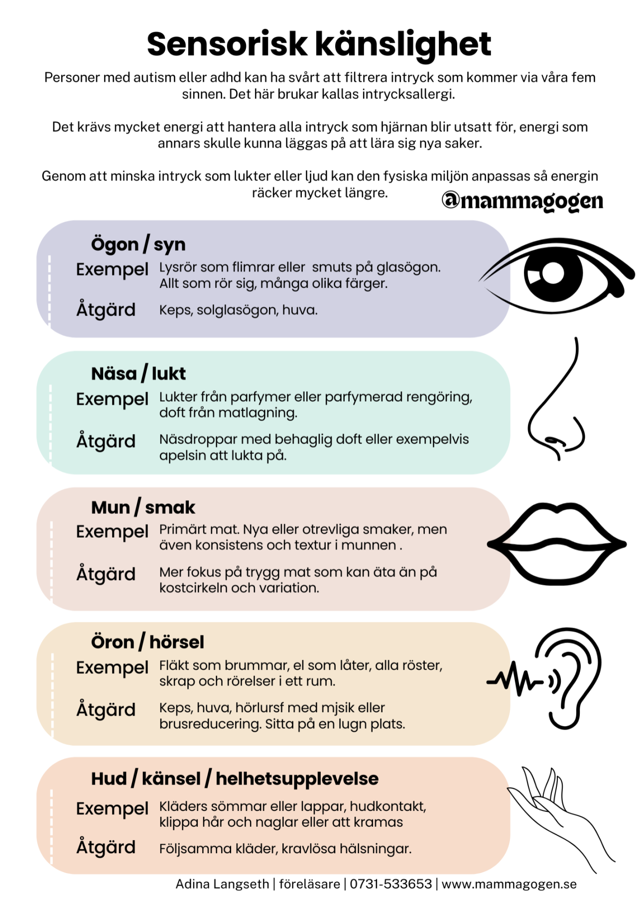 En sida med enkla ikoner och förklaringar om sensorisk känslighet. Ger snabb förståelse för hur sinnesintryck kan påverka personer med autism. Perfekt som introduktion eller påminnelse.