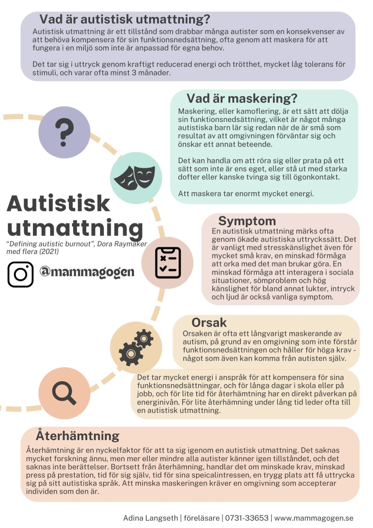 Tydlig förklaring av autistisk utmattning med hjälp av ikoner och korta beskrivningar. Visar vanliga tecken och orsaker på ett lättillgängligt sätt. Användbar som referens för både nya och erfarna.